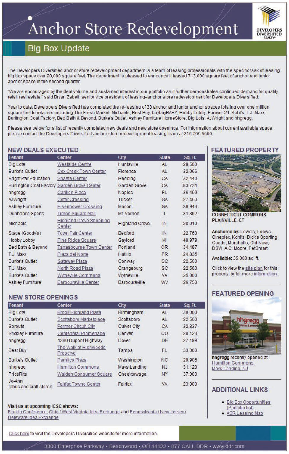 Developers Diversified Realty was looking for a way to get leasable space out to brokers. This HTML email was created to highlight those spaces, as well as to highlight recently-leased space.